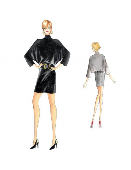 Weiches Minikleid mit Stehkragen, weiten Kimonoärmeln und Kordelzug in der Taille. Kann auch als Bluse genäht werden. Empfohlene Stoffe: Jersey, Paillettenstoff oder Chiffon.