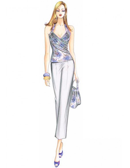 This American-style top is diagonally wrought with a draped panel. It has a sweetheart neckline with ribbon that passes as a drawstring through the top and is knotted at the back. Suggested fabric: jersey or stretch satin.