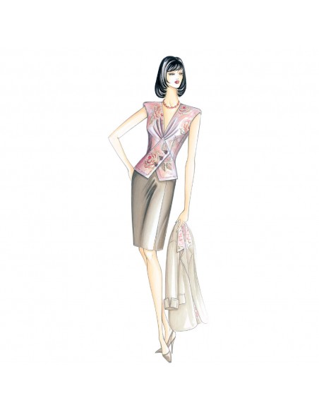 This top has a vest effect and is perfect under a jacket. It has padded shoulders, draping on the Vneckline that descend into a shaped basque. It is closed with three buttons and open at the bottom. Suggested fabric: crêpe de chine or jersey jacquard.