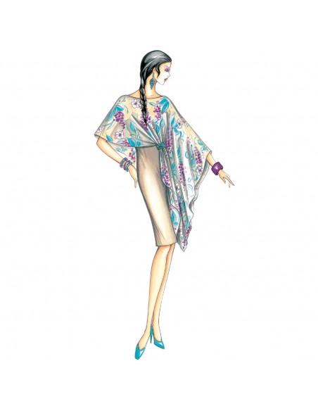 Raffinierte Kombination mit Trägerkleid in Krepp oder Satin und asymmetrischer Taschentuchhaube im Einzelstück. Auszuführen in Chiffon, Musselin oder Voile. Kann sowohl lose als auch in der Taille mit Strass-/Steinschnalle und einer leichten Drapierung gehalten getragen werden.