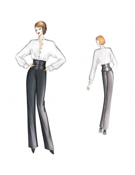This modern blouse has kimono sleeves wrought with lace inserts, a strip collar and cuffs with gem buttons. Trousers and corset n. 1509.
