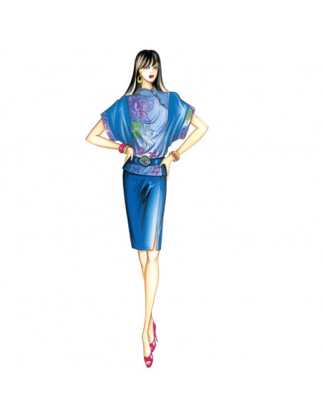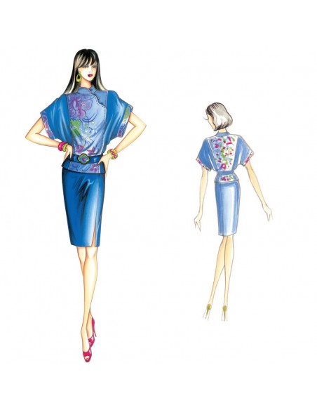 This Japanese-style tunic has a stand-up collar and opening at side. Suggested fabric: two-tone fabric. Skirt n. 2980.