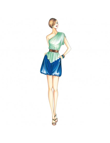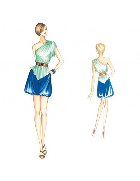 This tunic has a single shoulder that forms a kimono sleeve with gathers; it has a V-shaped hemline and the waistline is marked with belt. Suggested fabric: jersey.