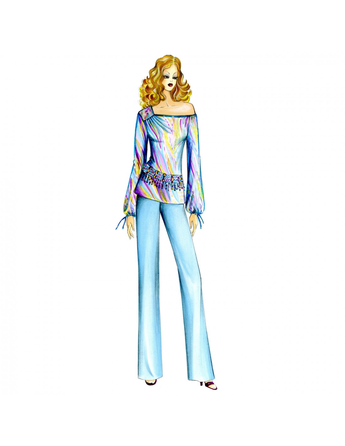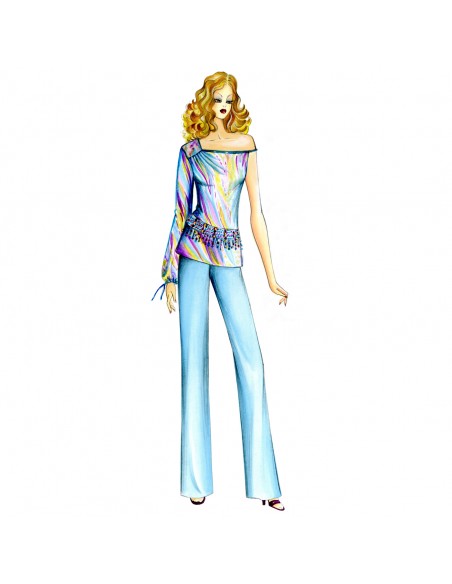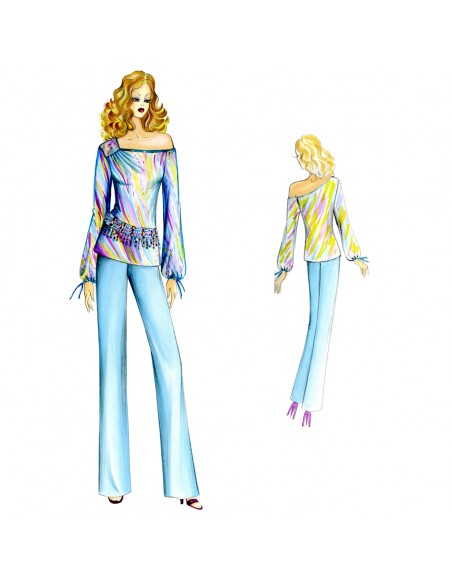 A psychedelic look for this blouse with a wide asymmetrical neckline held in place by an elastic band that uncovers one shoulder, and gathered sleeves at the cuffs. To be also made with a single sleeve. Recommended in lightweight jersey or voile. Trousers n. 5381.