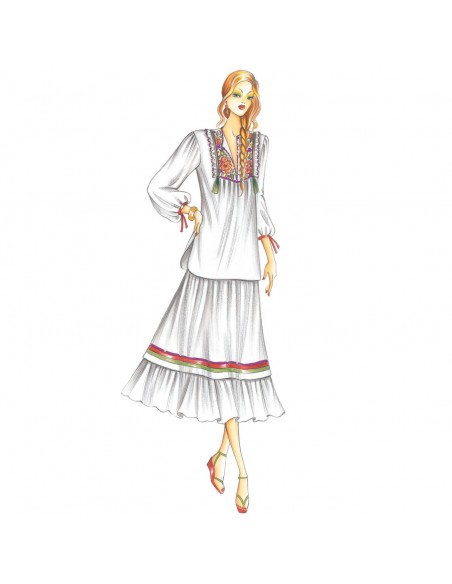 Mexican-style blouse with multicolored embroidered plastron and embellished with small volants and bows, and gathered sleeves with slightly dropped shoulders.