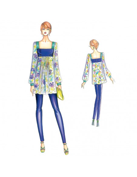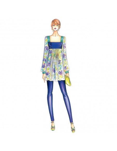 Flared tunic with pintucks at empire-line, square neckline and sleeves slightly gathered at shoulders and cuffs. Can be made in chiffon, jersey or crêpede- chine. Leggings, n. 3380, free printed pattern in catalogue insert.