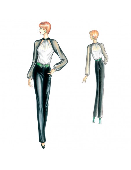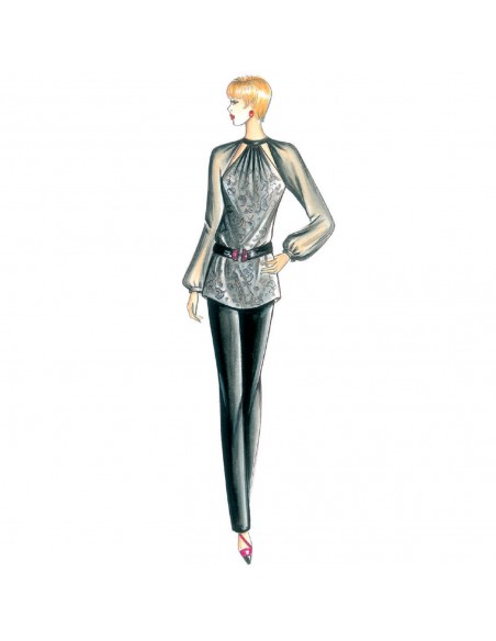 Loose, flowing blouse with round collar featuring gathering and slit detail, and raglan sleeves with gathered cuffs. Can be made in dual colour chiffon or printed jersey with muslin sleeves