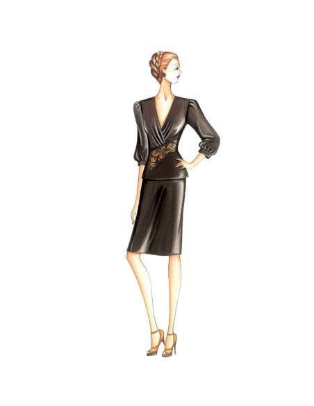 Fitted blouse with diagonal seam, high sculpted waist, pleats from neckline to waist, ¾-length gathered sleeves and embroidered peplum. Suggested fabric: crêpe-de-chine or printed jersey.