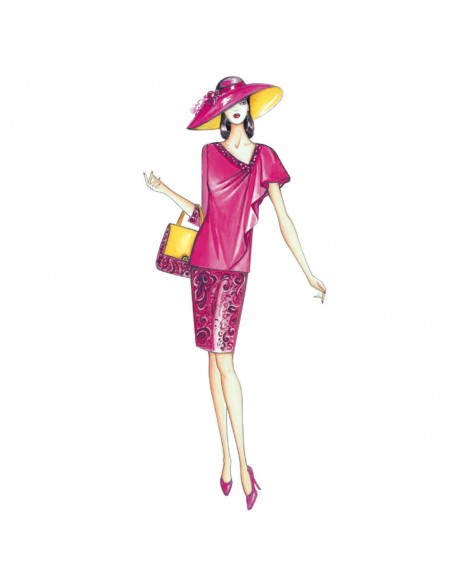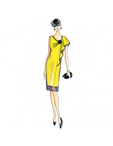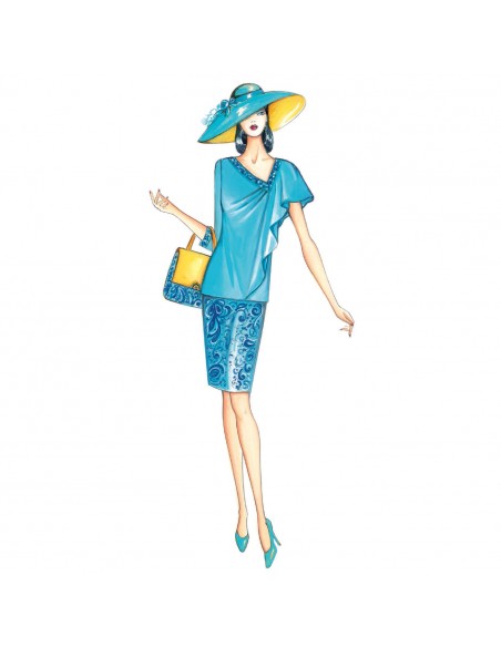 Semi-fitted blouse with converging pintuck detailon asymmetrical scoop neckline. Can be made with side frill and single palm-length sleeve, with two sleeves and no frill, or sleeveless with frill over one shoulder. Can also be made as a dress. Suggested fabric: jersey, cotton cady or satin.