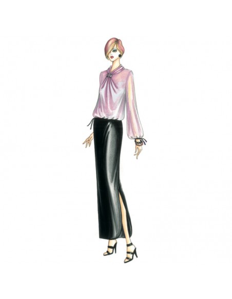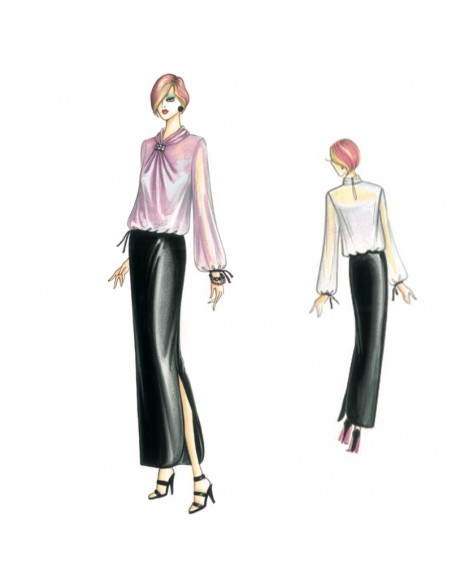 This blouse has an original draped scarf collar secured with a gem buckle. The hemline can be made puff or straight. Suggested fabric: chiffon or satin-crêpe.