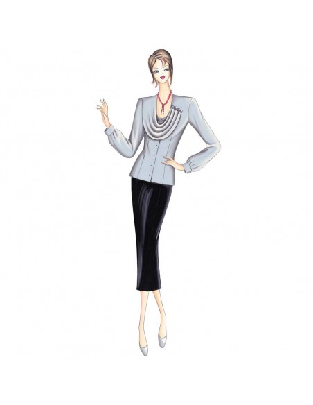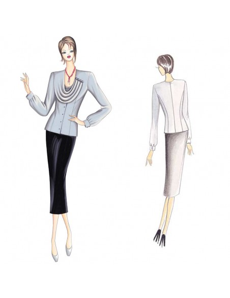 This form-fitting blouse has sleeves with round armholes and gathers at the cuffs. The shawl-like collar is softly draped with gathers secured by buttons. Suggested fabric: crêpe, satin or chiffon.