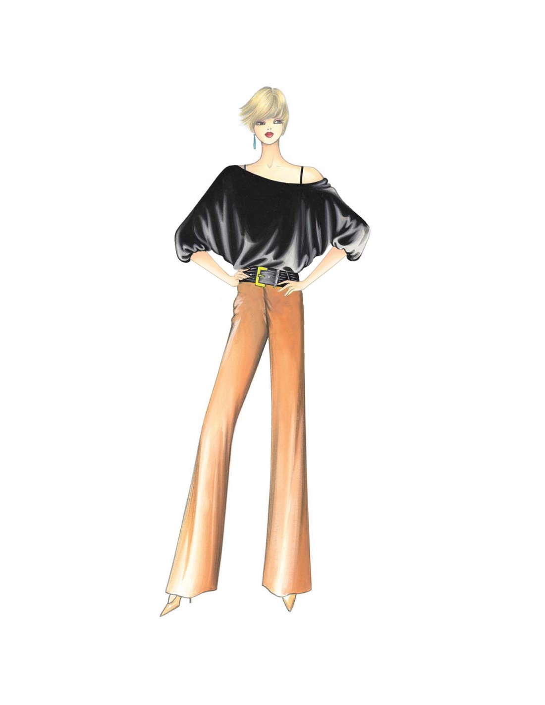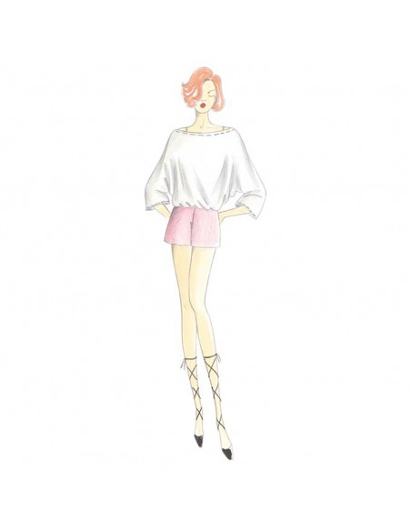 This blouse leaves the shoulders bare and has broad kimono sleeves with wide gathered cuffs. The back has a deep neckline secured by strings. Suggested fabric: chiffon, jersey or some other soft fabric. Simple straight skirt, in this case with side opening, n. 5045. Shorts n. 8668. Trousers n. 1775.