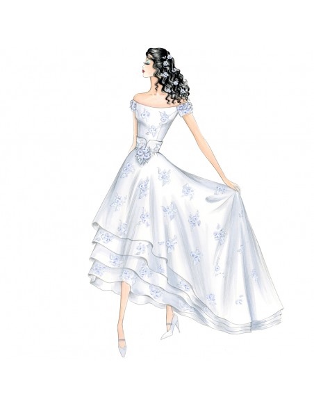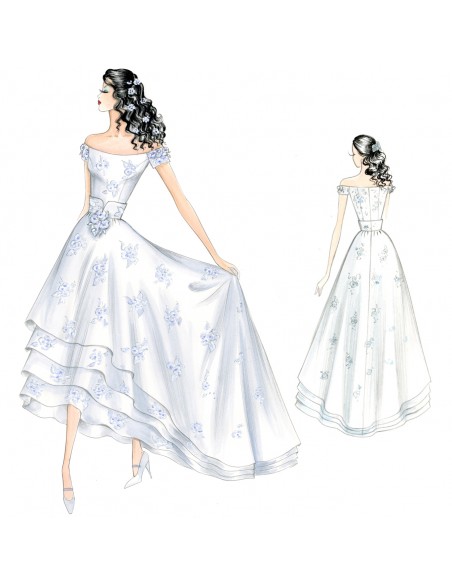 Décolleté dress with a wide, multi-lenght, multi-layered skirt that descends to create a short train. To be made in jacquard satin in refined pearl grey or in silk tulle with lace appliqués.