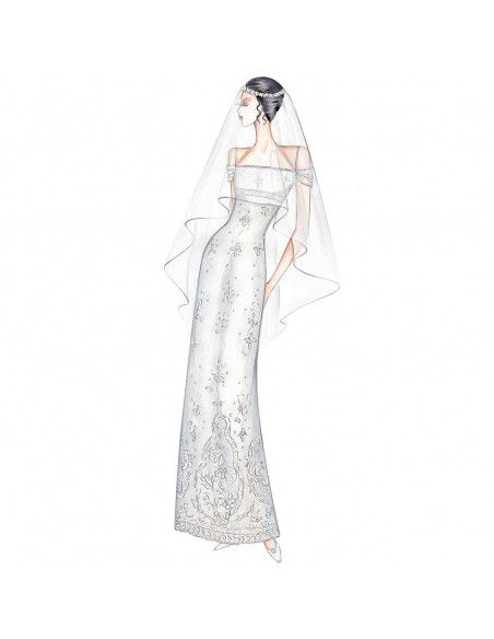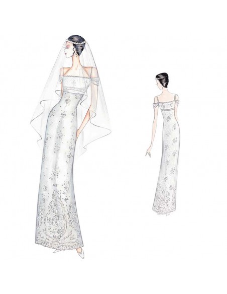Layered embroidery enhances this straight, empire gown with draped sleeves that frame the shoulders and crossed straps. Suggested fabric: tulle.