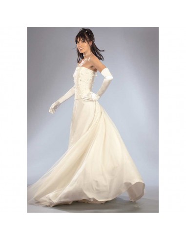 Vintage eighteenth-century reminiscences for this dress with simple décolleté bustier and wide, multi-layered skirt centrally rounded with double ruffled ruffles. Recommended fabrics: lace and organza or tulle. To be made with crine underskirt and lining.