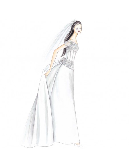 This refined outfit has a corset top enhanced by wide lace edging at the neckline and at the bottom. The flared skirt has a simple train. Suggested fabric: mikado, gazar or triple organza.