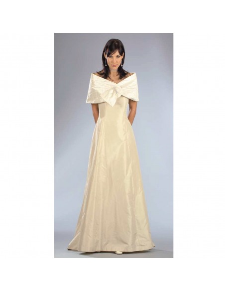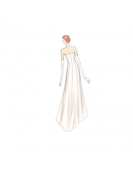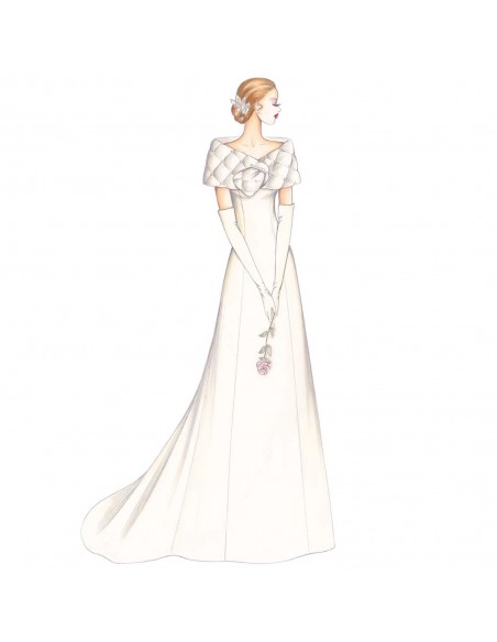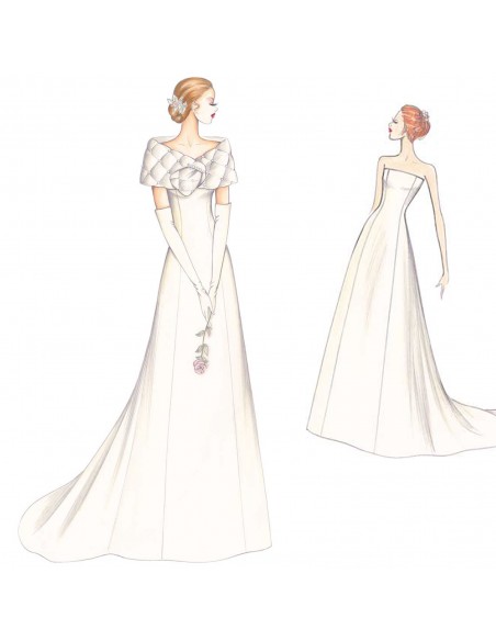 This dress has a purity of line. The low-cut neckline is divided into panels shaped onto the bodice and flared at the bottom. The rounded stole has a button-hole for crossed closing. Suggested fabric: mikado, taffeta, velvet or triple organza for the dress, quilted taffeta padded on the inside for the stole. For a more summery version the stole can be made of organza or metallic taffeta or mikado without padding inside.