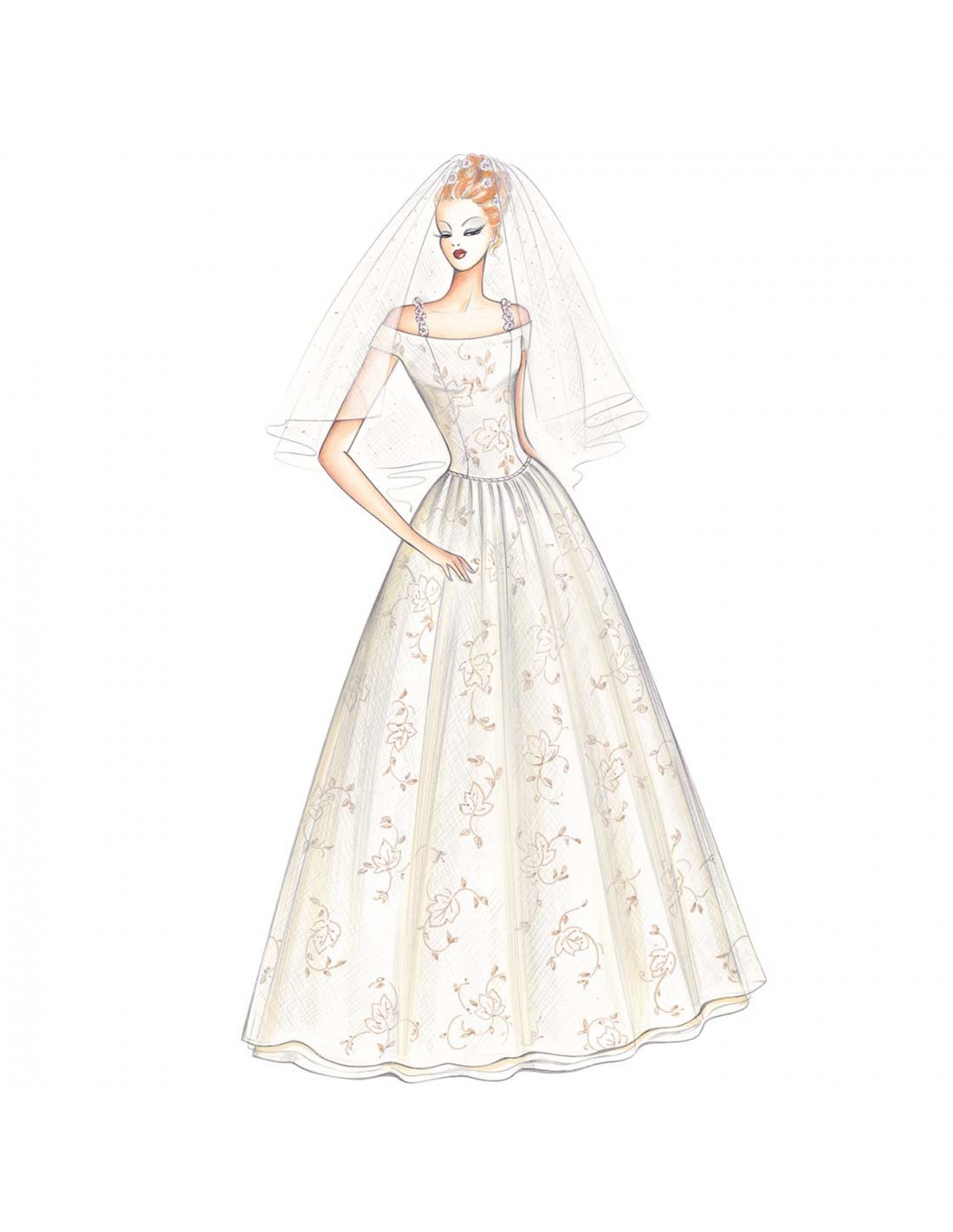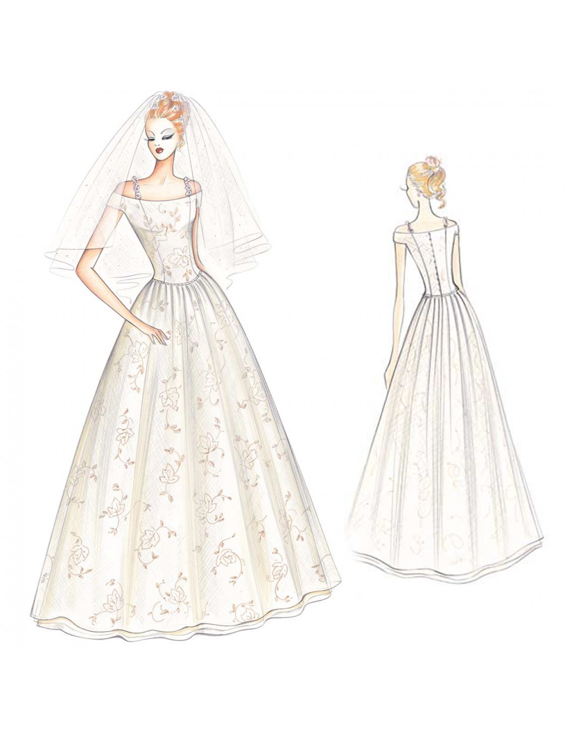 This gown has a corset that leaves the shoulders bare, clasped with floral straps, and a broad gathered skirt of fabric cut on the grain. Suggested fabric: delicate lace or tulle.