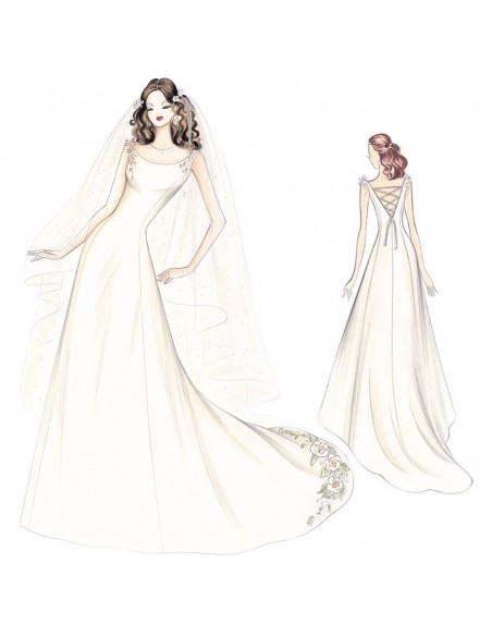 Delicate flowers with pendants adorn the shoulders of this sleeveless princess gown with its rounded neckline that descends into a V at the back and is closed with crossed strings. The gown opens into a long train with flowers at the bottom. Suggested fabric: triple organza, mikado, Duchess satin or gazar.