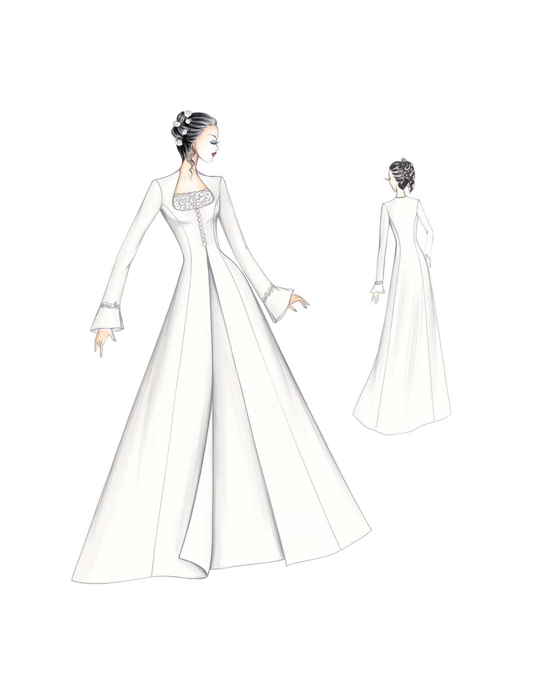 This regal gown has a long edge-to-edge riding-coat cut with panels flared at the bottom. The heart-shaped neckline leaves a glimpse of lace. The sleeves have volants with slits in the cuffs. Suggested fabric: mikado. A lace insert adorns the neckline of this sleeveless princess gown with square neckline. Suggested fabric: mikado.