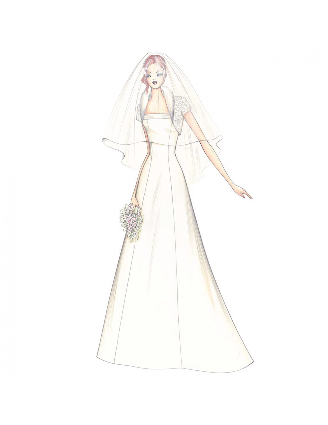 This princess gown has a clean-cut silhouette. Satin edging outlines the neckline. The kimono shoulder wrap has a shawl-like fur collar. Suggested fabric: mikado with lace shoulder wrap.