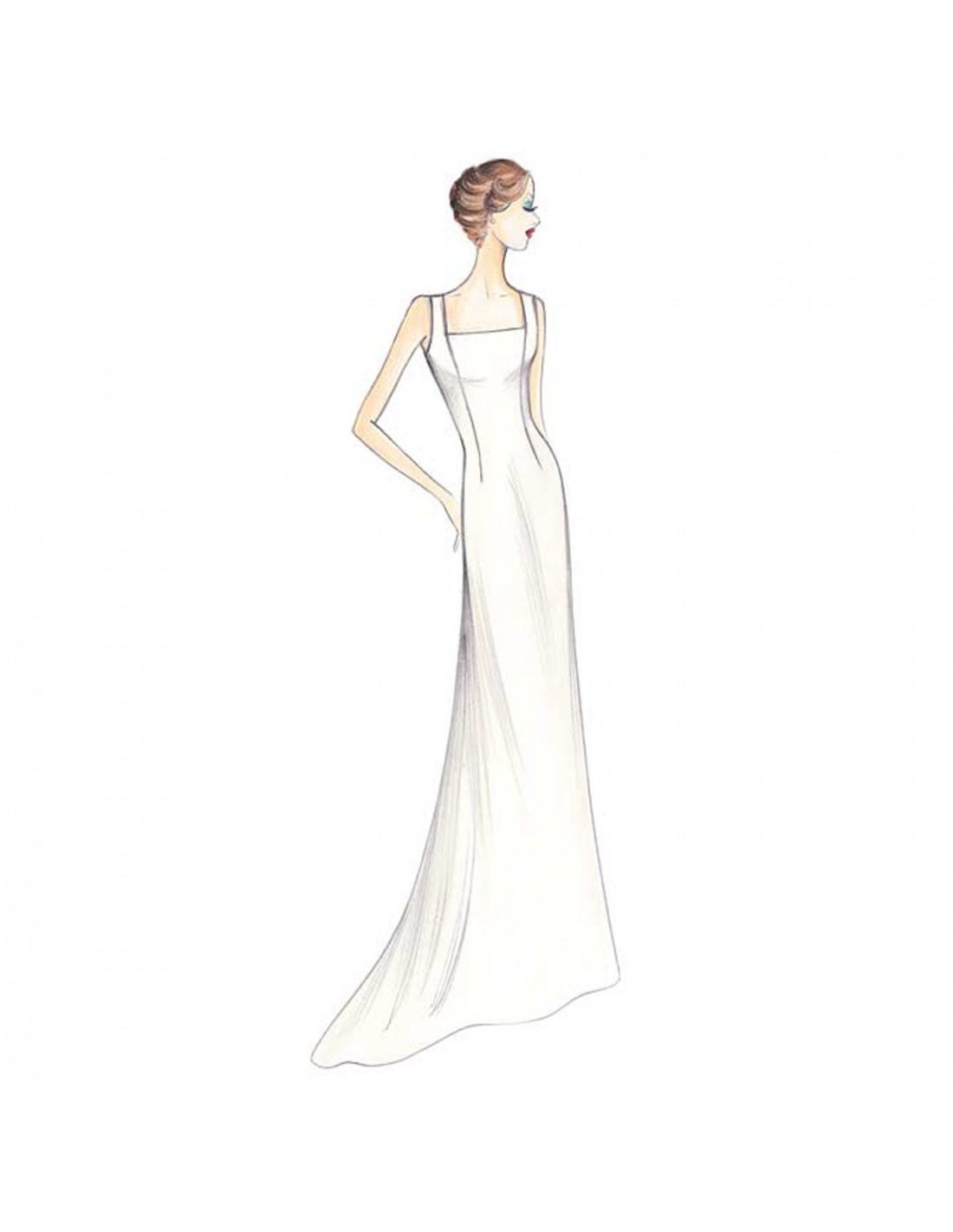 This mermaid-style gown has a square neckline and slightly indented, rounded armholes. The outfit is completed with a tight-fitting jacket secured with a frog. The jacket has short kimono sleeves and lace flower pendants. Suggested fabric: crêpe-satin.