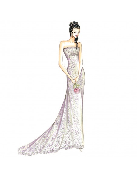 This form-fitting gown is opened at the bottom. It has tight vertical draping along the neckline and is framed with a draped sash with buckle at the empire waistline. The neckline leaves an opening at the décolleté and the sleeves have broad ruffles that start at the shoulders. Suggested fabric: Chantilly lace and chiffon.
