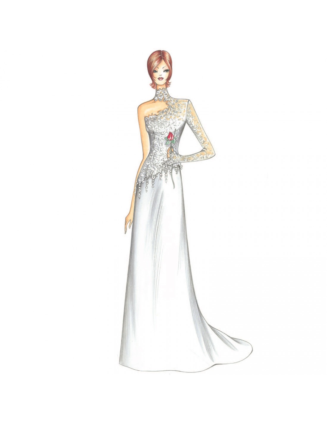 Original, trendy gown with tight-fitting, destructured lace bodice with irregular cut and asymmetrical lines, a single glove-like sleeve that extends down to the hand. The minimalist skirt cut on the grain has a short train. Suggested fabric: satin, cady or chiffon.