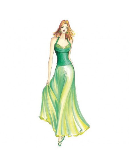 This corset top has a sweetheart neckline adorned with lace and arched, overstitched edge. Suggested fabric: duchesse satin, taffetas, light denim.