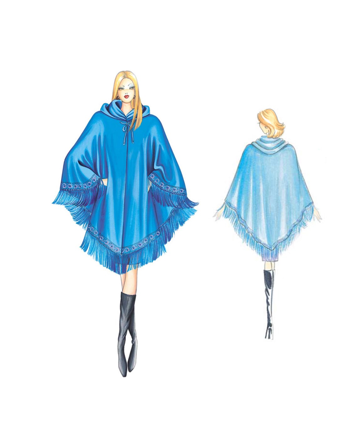 This mantle has a hood, edged with trim and wool fringe.