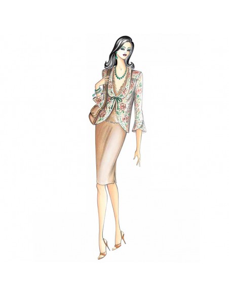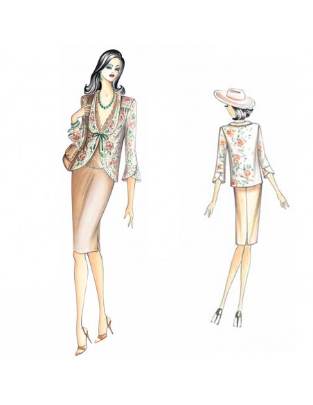 This straight cardigan is closed with a ribbon. It has an offset shawl collar and deep, rounded neckline. The 3/4 sleeves are flared at the cuffs with crossed ruffles. Suggested fabric: voile or crêpe de chine. Skirt n. 1249.