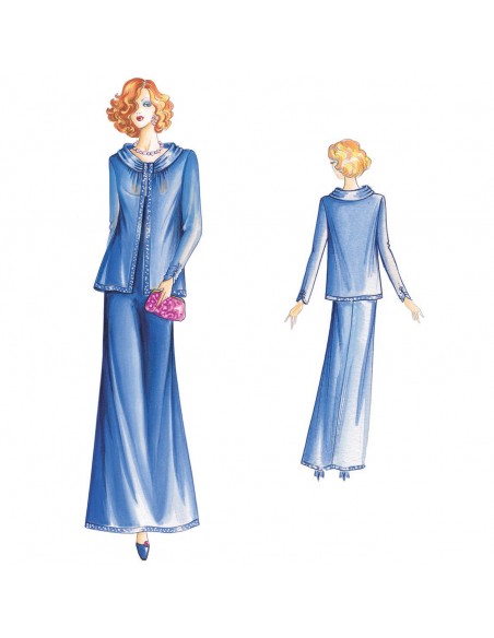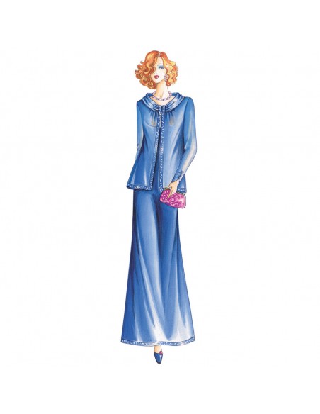 This cardigan has a ring collar, slight draping and closes edge-to-edge. Dress n. 2348.