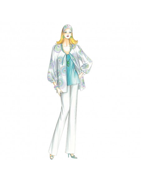 This straight cardigan closes with a ribbon at the neckline. It has ¾ raglan sleeves gathered at both the cuffs and shoulders. Suggested fabric: crêpe de chine, voile, satin, muslin.