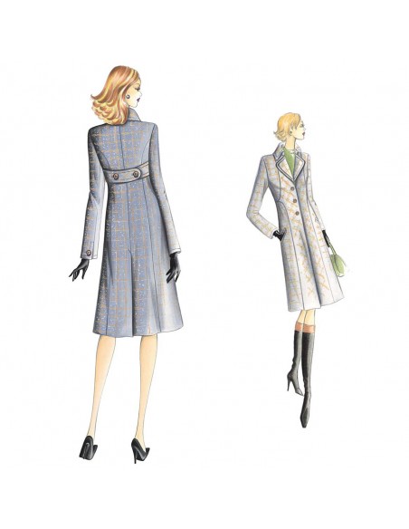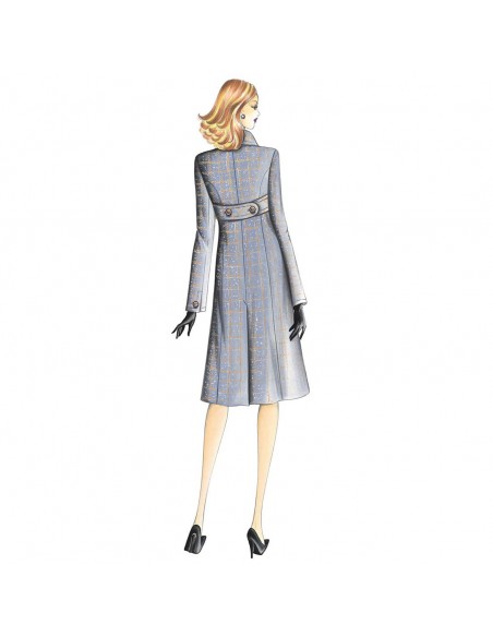 Inspired by the 1960’s, this coat is both tight-fitting and flared with original rounded cuts. It has a raised half-belt that creates an empire effect and a Napoleon collar. Suggested fabric: woven fabric, plaid, Prince of Wales or damask with velvet details.