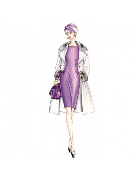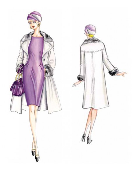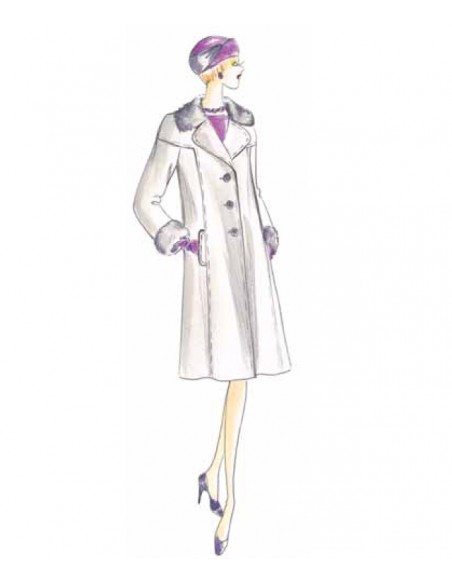This single-breasted, A-line coat has sleeves with drooping armholes that form a yoke at the back and long tapered lapels. Suggested fabric: velour or fabric with fur collar.