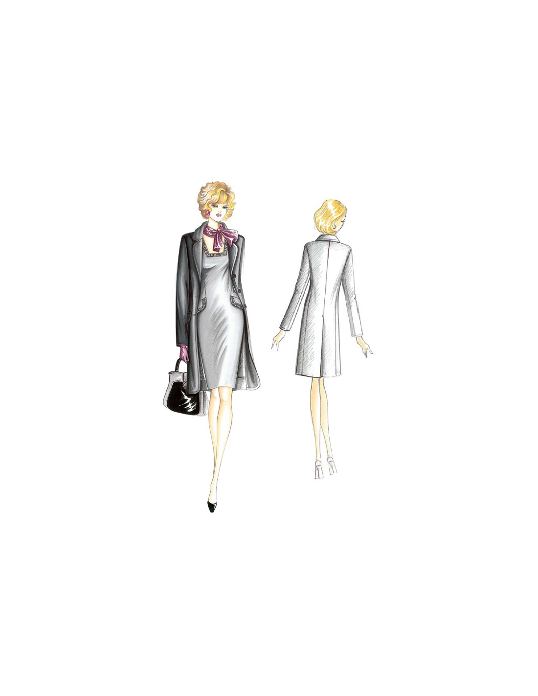 This men’s-style, single-breasted coat is relatively straight. It has a sporty collar and inset pockets with flaps. Suggested fabric: plain fabric, velour or English weave.