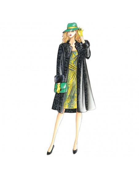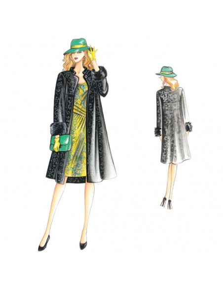A-line cloak, tube collar and welt pockets. Suggested fabric: damask wool.