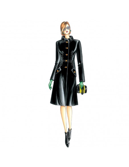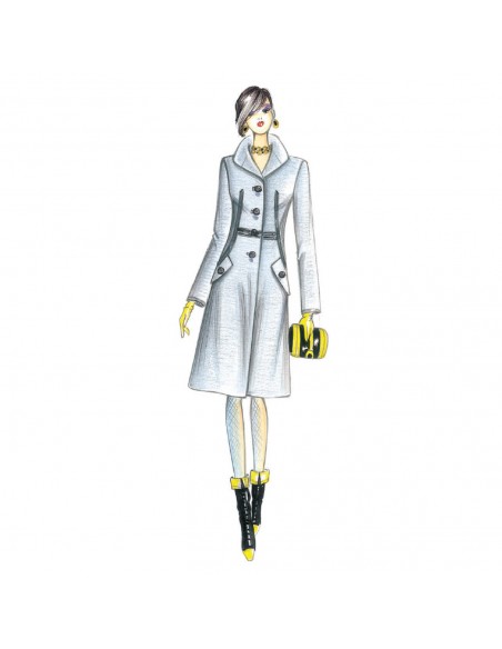 Elegant, semi-fitted single-breasted coat with flared skirts, mock neck, curved seam darts emphasized by double stitching, and tuck-in pocket flaps. Suggested fabric: boiled wool, baize or vicuna.