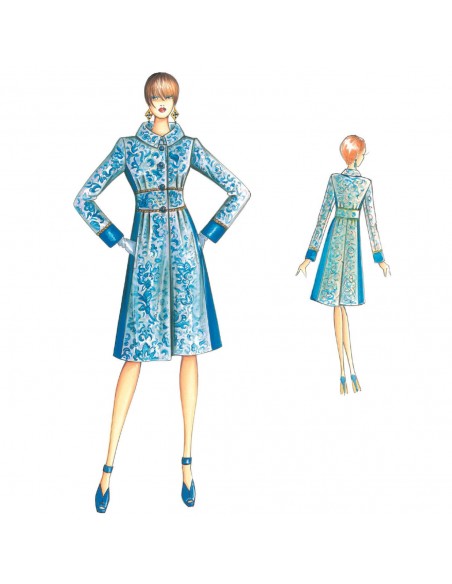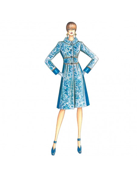 Inspired by the orient, this loose-fitting coat with mock neck, cuffs and sash belt with chain detail can be made in patterned wool or damask with matching side panels, which cover hidden pockets.
