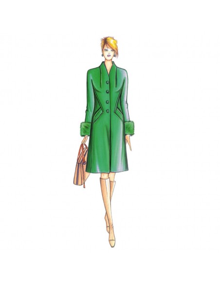Single-breasted loose-fitting coat shaped by geometric seams, with kimono-style sleeves, stand-up collar featuring loose tucks, diagonal pocket flaps, and inset pockets. Suggested fabric: flannel, velour, vicuna.