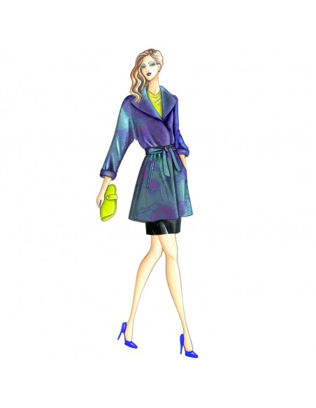 Straight-line single-breasted short coat with turned-up kimono sleeves and raised collar with triangle lapels that can also be closed. Can also be made with a belt tied at the waist. Recommended fabrics: Prince of Wales, tweed, light wool cloth or vicuna.