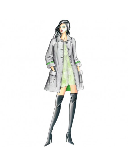 Semi-fitted single-breasted trench-like coat with shirt-style collar, raglan sleeves, patch pockets with turn-down flaps, and pointed yoke at back with box-pleat detail. Mini-jumpsuit n. 6931. Dress n. 3366.