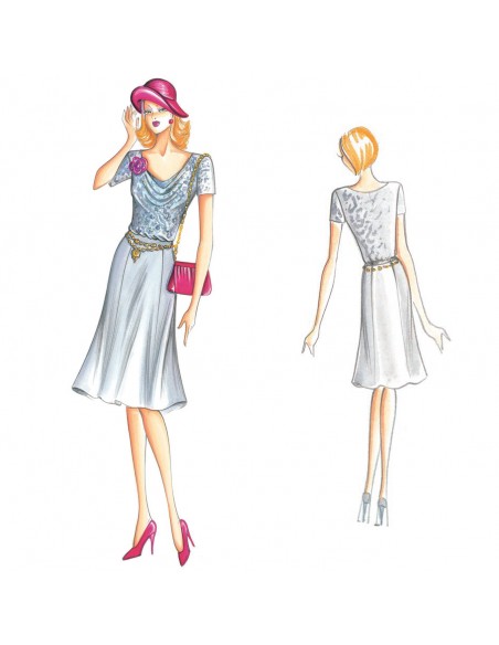 Blouse with draped neckline and short sleeves. To be made out of viscose wool, silk, or other soft material. Skirt n. 3074.