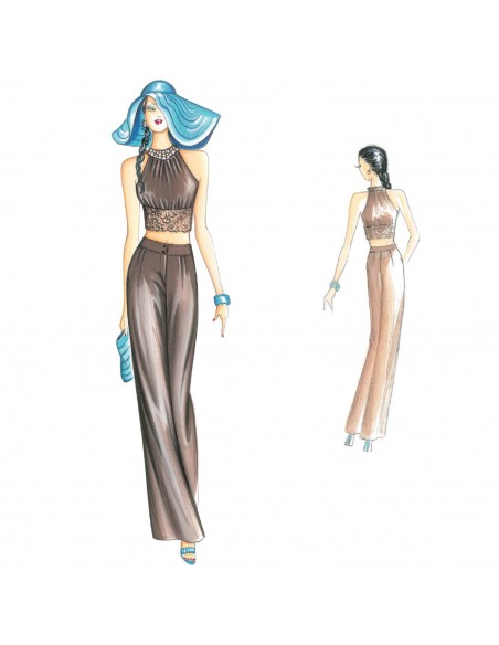 Two-piece featuring top with elasticized lace bands and loose trousers, Suggested fabric: a light fabric.