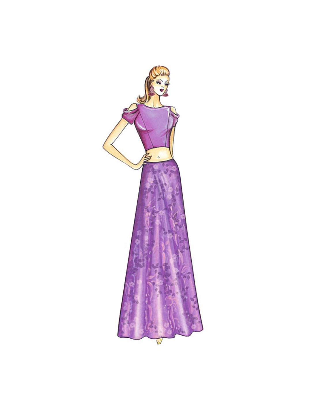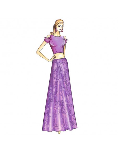 Tight-fitting crop top with short sleeves, exposed shoulders and simple crew neckline. Suggested fabric: jersey. Long flared skirt no. 6790.