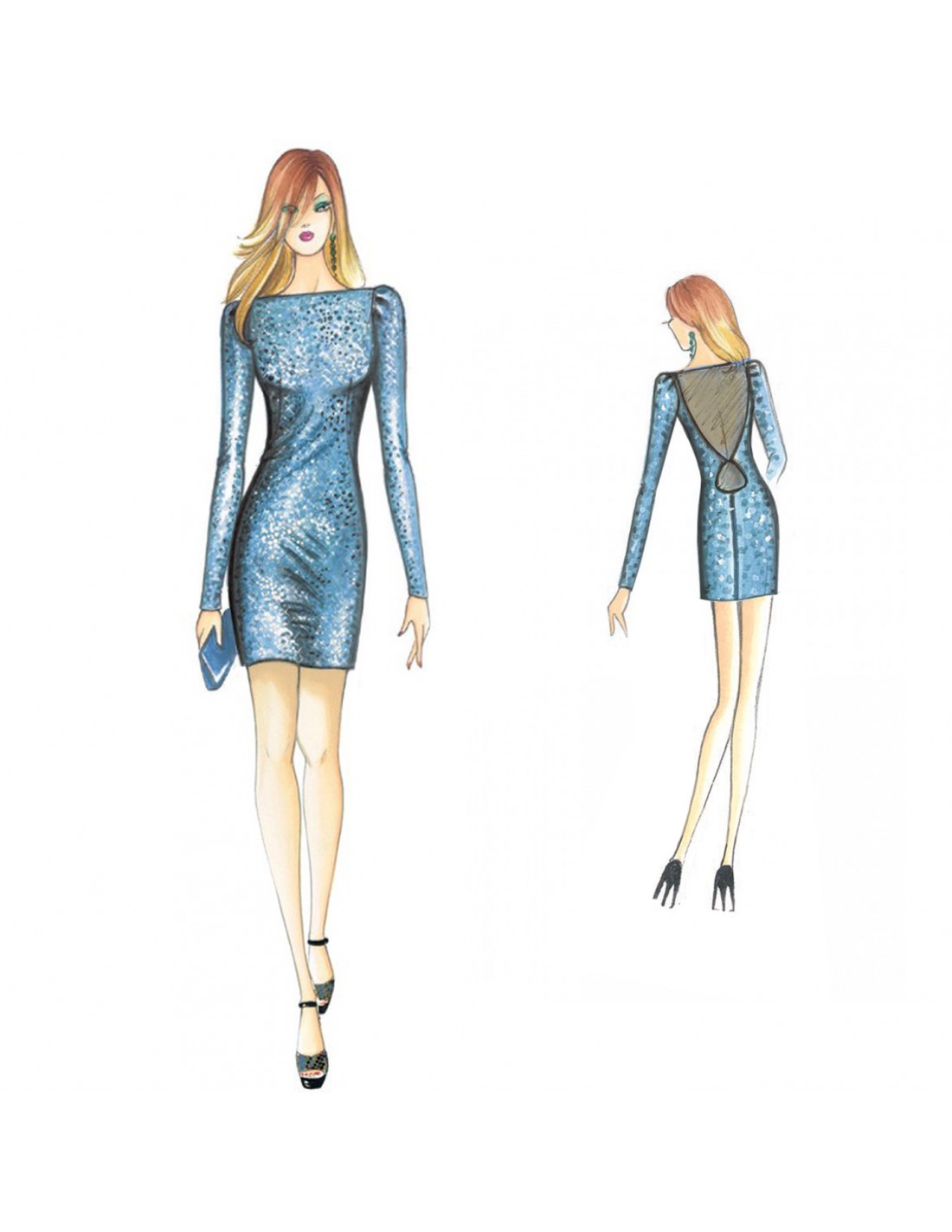 Sheath dress with slit boat-neck, opening on the back veiled by organza or tulle and wedge-shaped split at hem. Suggested fabric: sequinned or velvet. Can also be made in mini or long version.