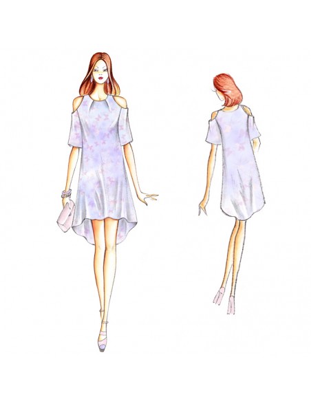 Flared mini-dress with cut-out openings which feature exposed shoulders and can be made with or without volant, elbow-length flared sleeves, pences at crew neck and dipped hem at the back. Practical, chic, suitable for all sizes, easy to sew, its versatility allows to make it in many different styles. It can be worn both alone and with skinny pants.