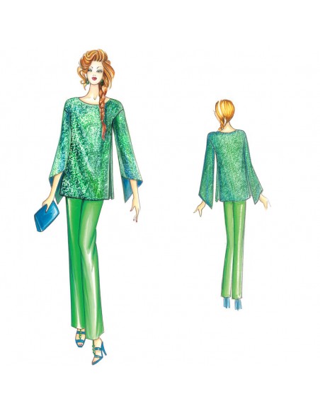 Tunika in A-Linie aus Musselin, Chiffon oder Pailleté, Falten an den Seiten, abgesenkte Ärmel mit schalartigen Spitzen.