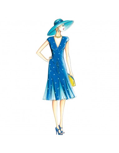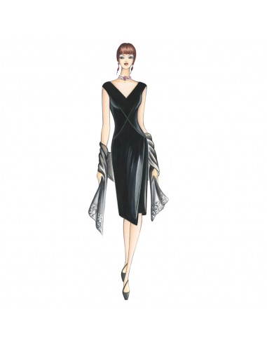 Twenties-style dress with lateral drape motif, threelength asymmetrical skirt, and long split. It can also be made in a negligee version without lace yoke.