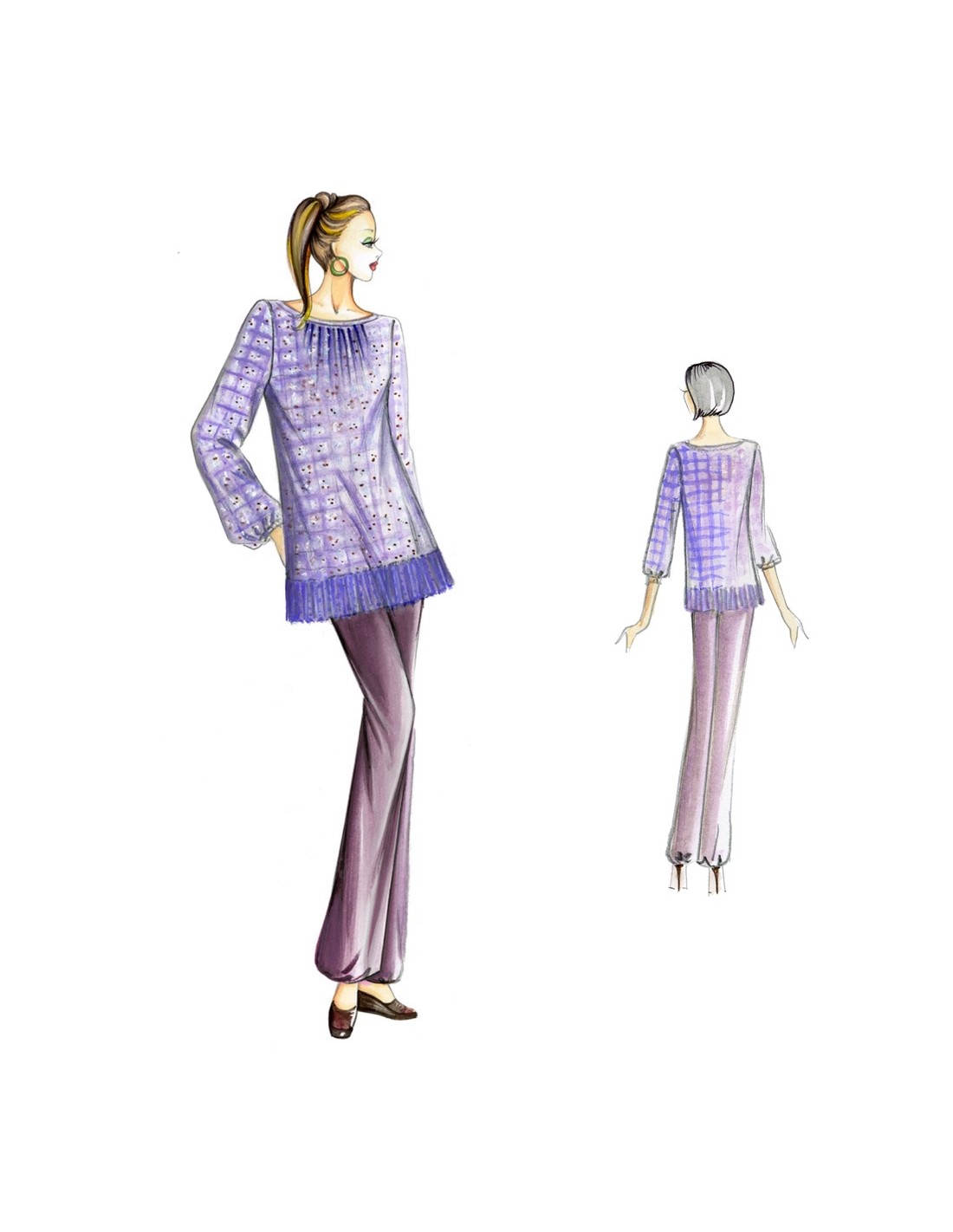 This slightly flared tunic has set-in sleeves gathered at cuffs, gathered neckline and a fringed hem.